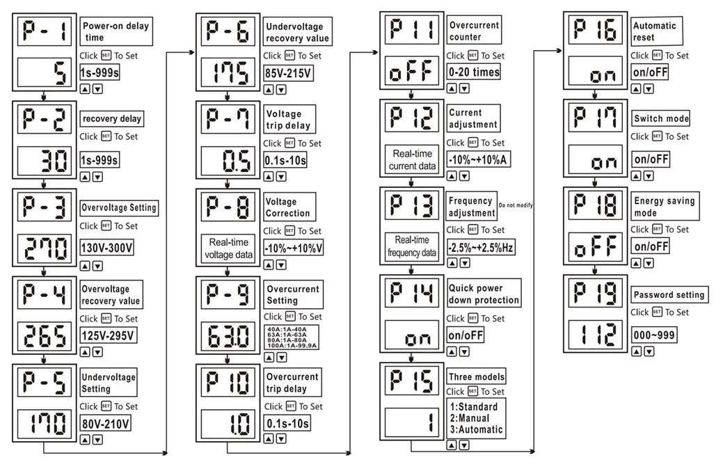 Лавзаҳои дарозии поёниро барои 5s зер кунед, то ба ҳолати муқарраршуда ворид шавед, тугмаҳои боло ва поёнро барои тағир додани шиддат ва шиддати ҷорӣ пахш кунед, тугмаи Танзимотро барои наҷот пахш кунед.